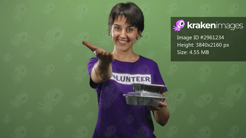 Woman with volunteer shirt holding foil food trays and outstretched hand in studio; generosity welcome.