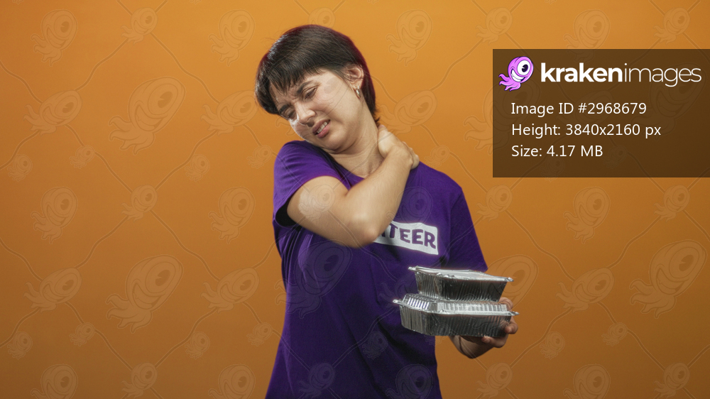 Woman volunteer with short hair holding stacked foil meal containers and rubbing neck while grimacing in studio; fatigue service duty.