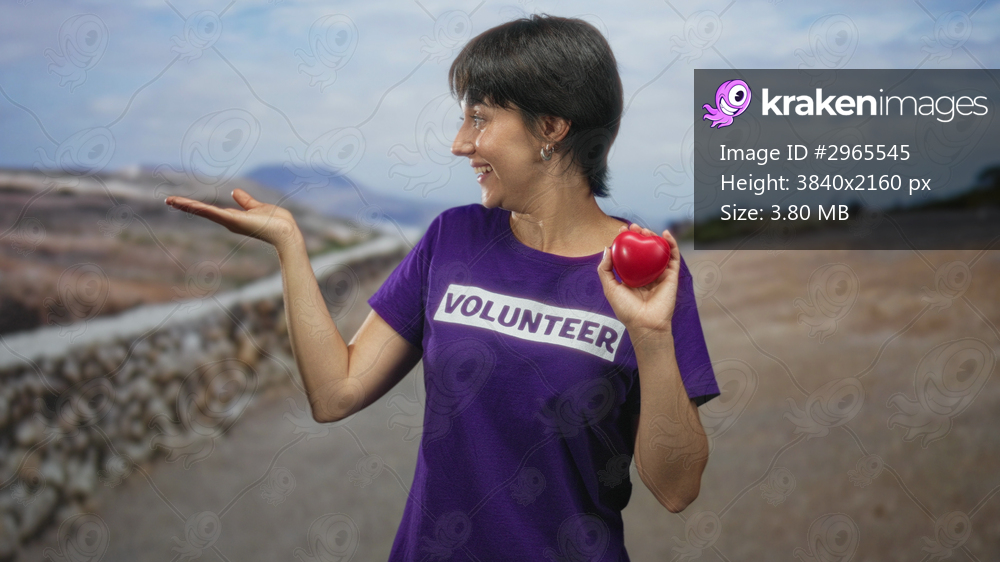 Woman volunteer with short hair smiles, wearing purple volunteer t shirt, holds red heart in right hand and shows left palm up on street with stone wall; hope charity outreach. - Kraken Images