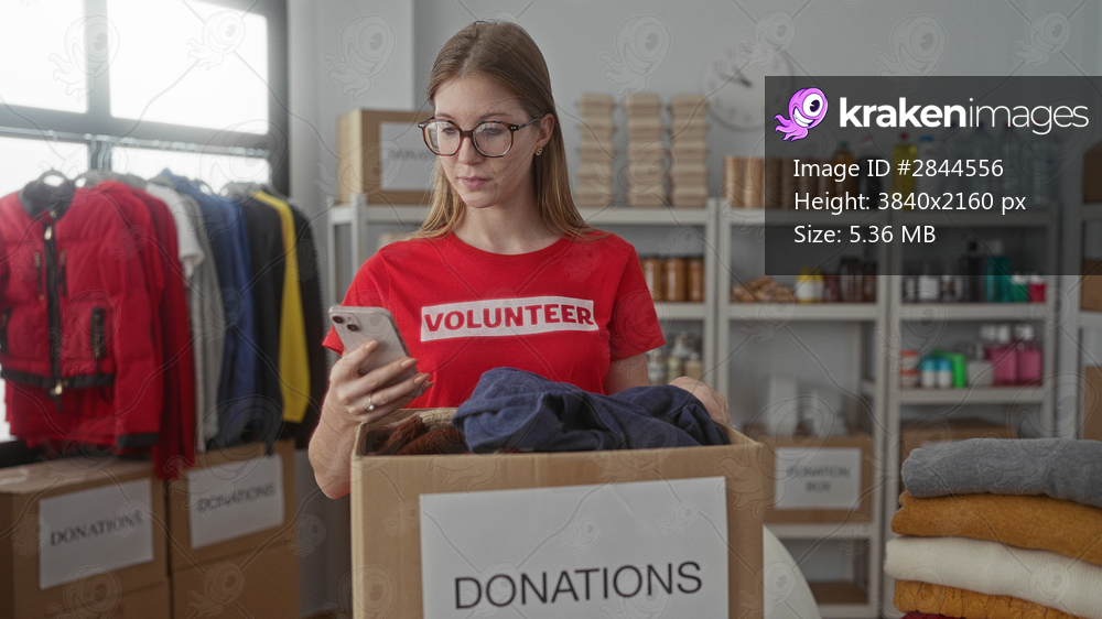 Woman volunteer sorts donations and taps smartphone in a donation center building; charity community.