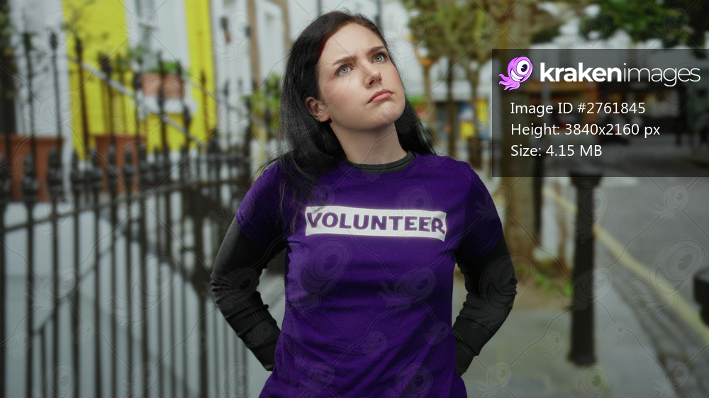 Woman volunteer standing outdoors on a street wearing a purple shirt with arms crossed, surrounded by colorful buildings and trees in the background.