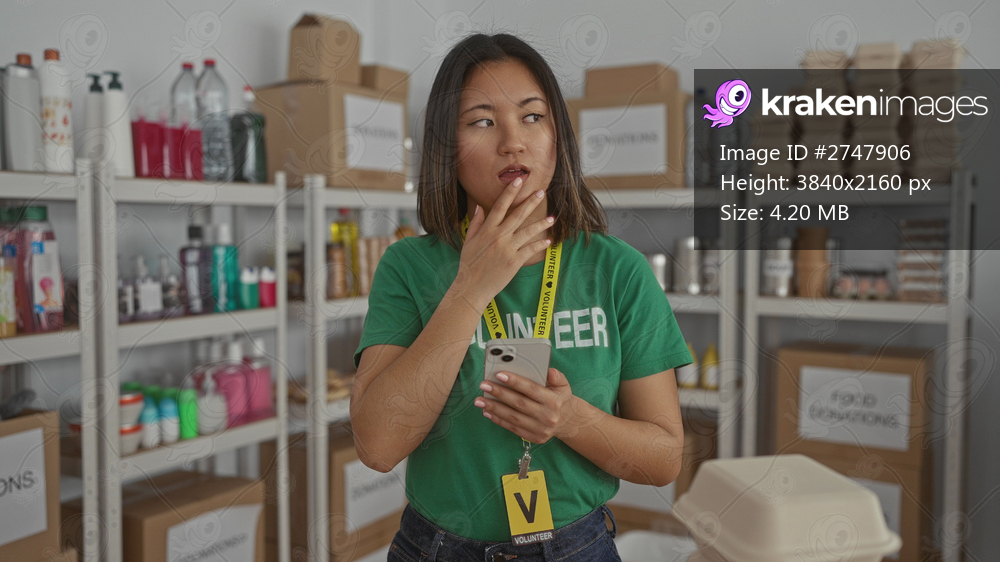 Woman volunteer using smartphone in donation center surrounded by boxes and supplies in an organized room.
