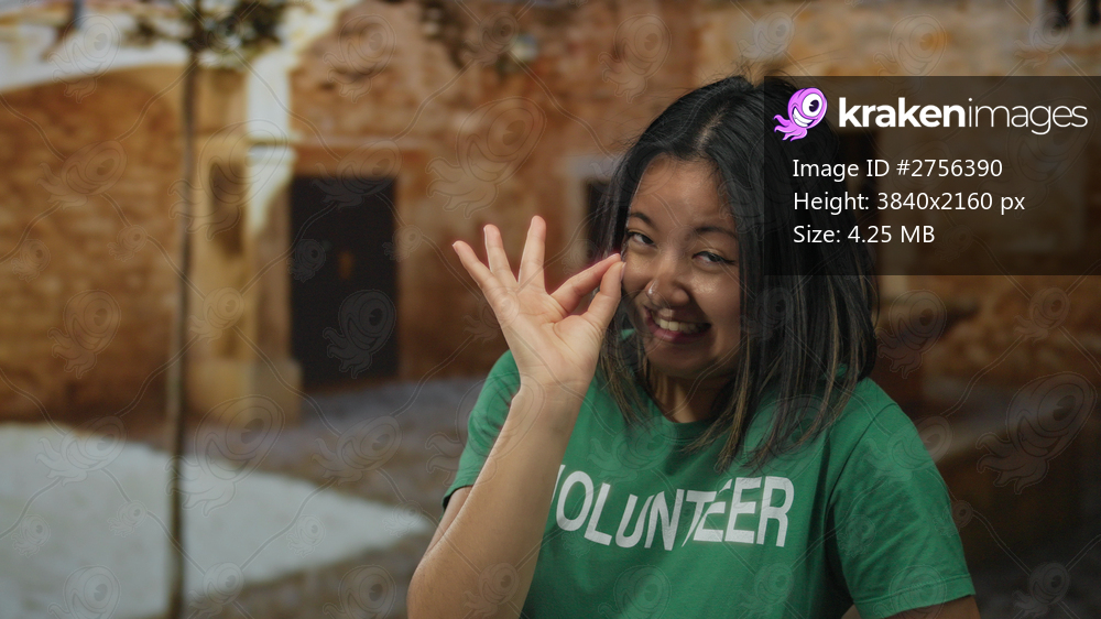 Woman volunteer wearing a green t-shirt makes small gesture on a city street, smiling vibrantly in an outdoor setting.