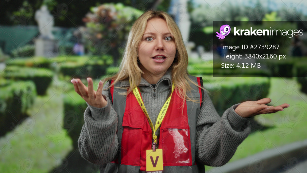 Woman volunteer wearing a red vest gestures passionately in a vibrant park setting, highlighting her enthusiasm and dedication to community service outdoors. - Kraken Images