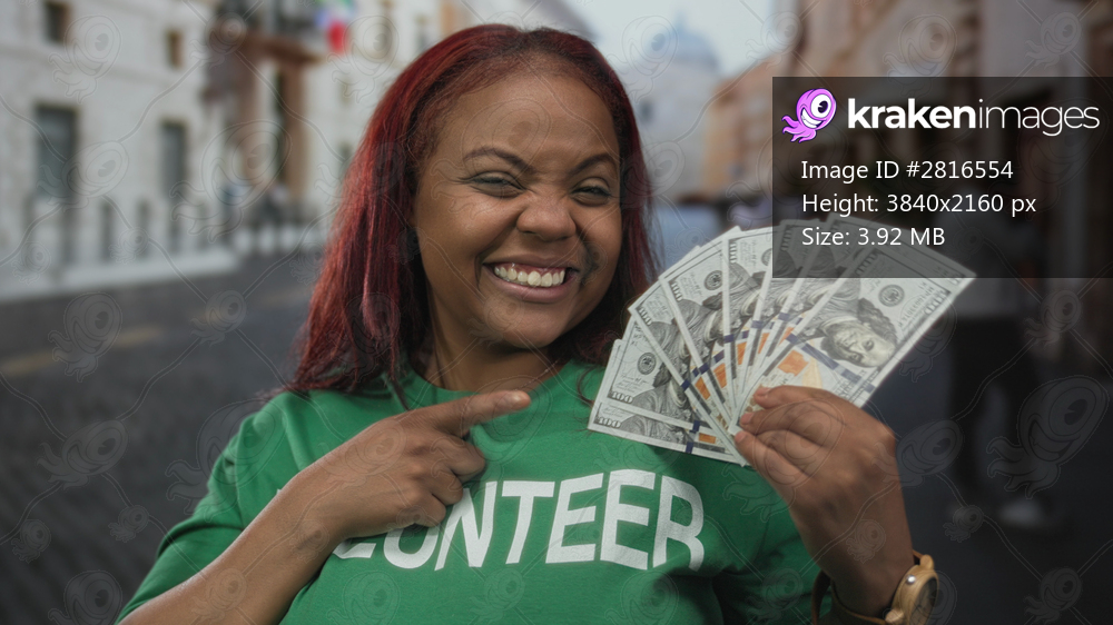 Woman volunteer wearing green shirt holds fanned us dollar bills on street and gives thumbs up; charity support joy.
