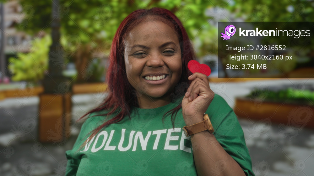 Woman volunteer wearing green shirt holds red heart card with finger in building and smiles softly; compassion.