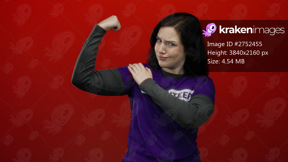 Woman volunteer wearing purple shirt makes strong gesture against vibrant red background portraying empowerment.