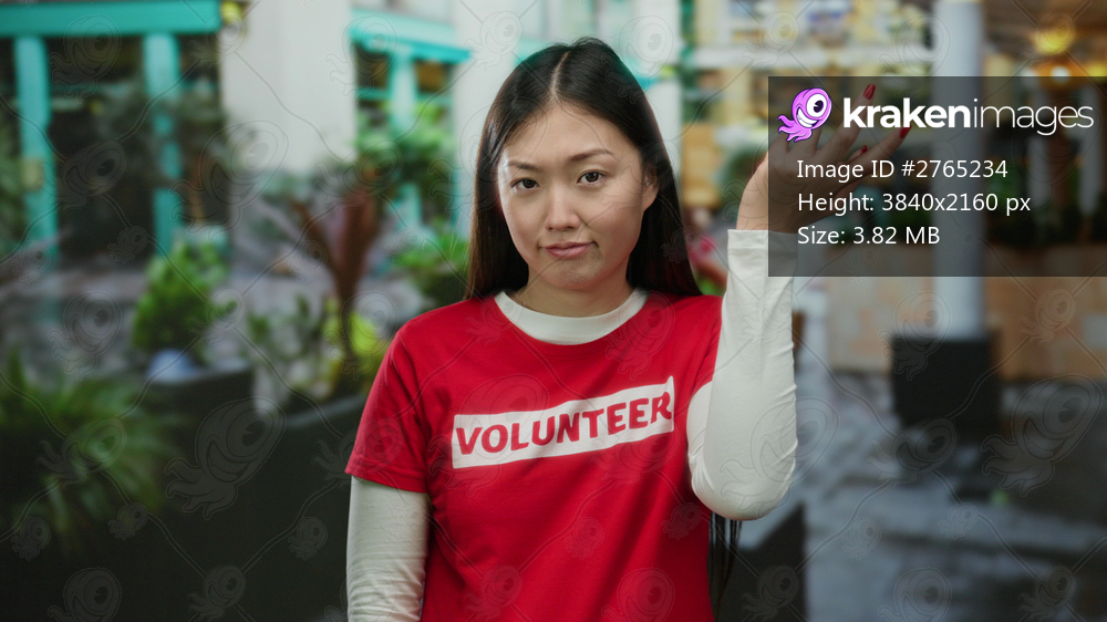 Woman volunteer wearing red shirt stands in urban street with modern buildings.