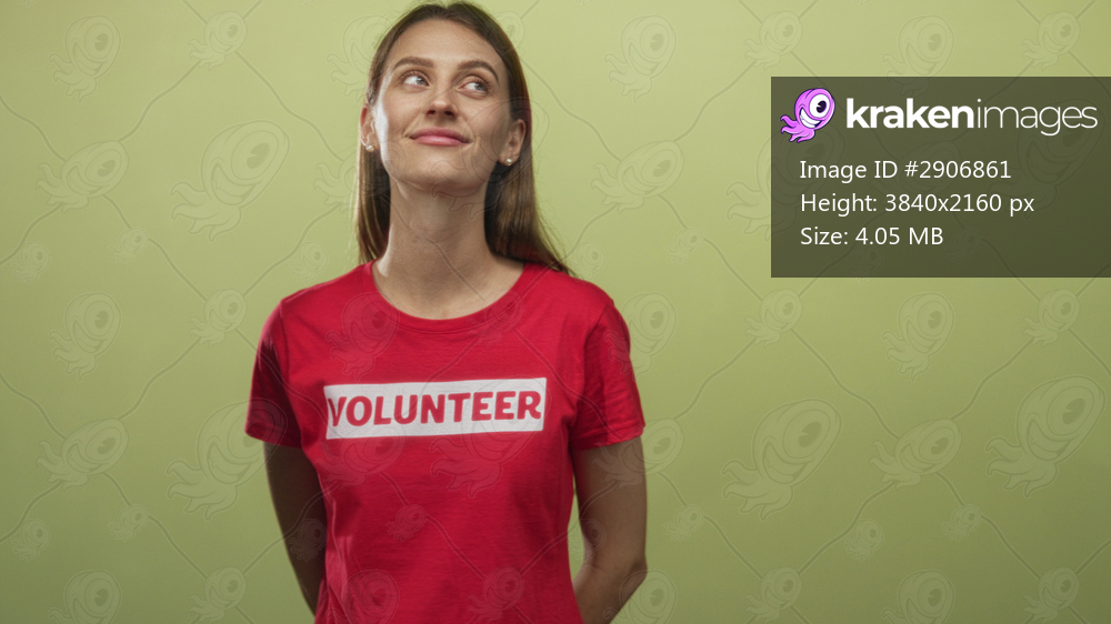 Woman volunteer wearing red volunteer t shirt with logo, hands behind back and looking up in green studio; community service hopeful.