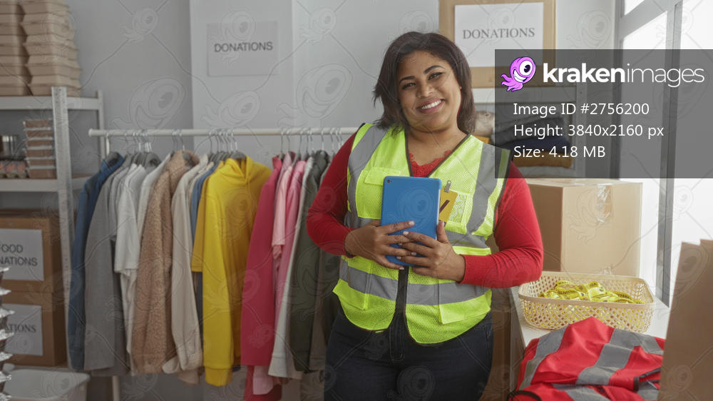 Woman volunteer wearing reflective vest using tablet in charity donation center surrounded by clothing and boxes.