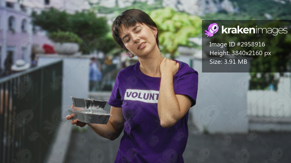 Woman volunteer young short hair holding stacked aluminum meal trays, grimacing and rubbing neck with neckache by street railing; fatigue duty.
