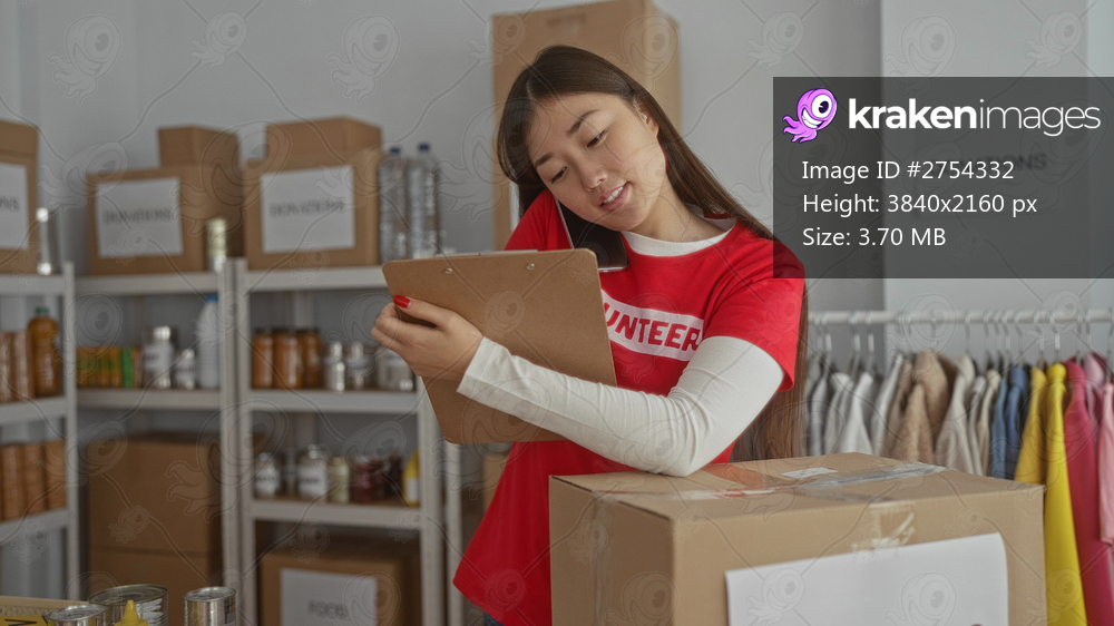 Woman volunteering at a charity center checks donations on a clipboard while talking on the phone, surrounded by boxes and organized shelves indoors.