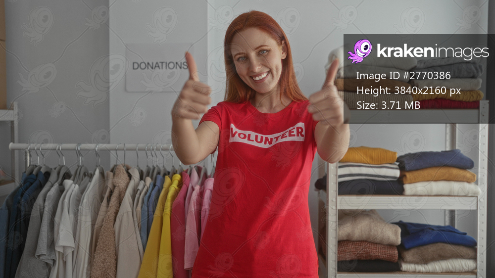 Woman volunteering enthusiastically in a charity donation center, wearing a red shirt, gesturing thumbs up amid shelves of clothes.