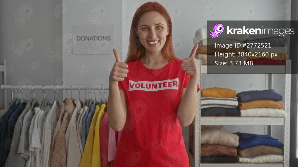 Woman volunteering enthusiastically in a charity donation center, wearing a red shirt, gesturing thumbs up amid shelves of clothes.