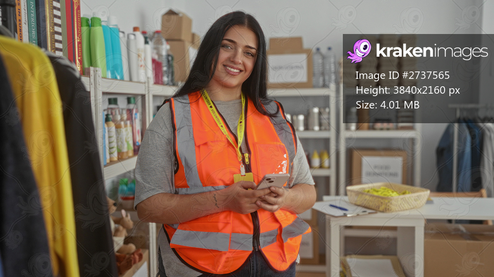 Woman volunteering in a donation center room checking phone while surrounded by products and clothing, wearing a bright vest in an indoor charity environment. - Kraken Images