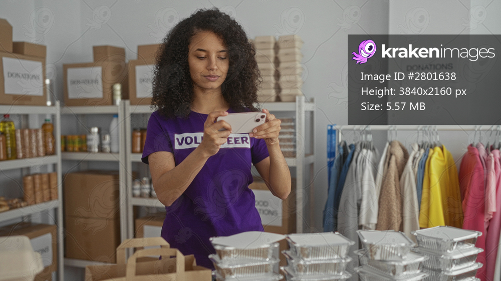 Woman volunteering indoors takes photo in charity center with donation boxes and clothes rack.