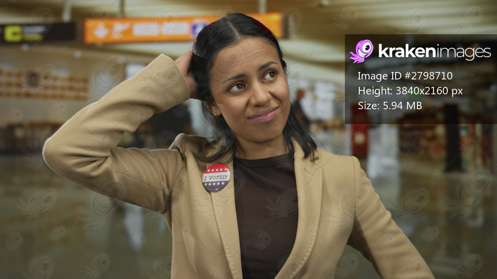 Woman with voting badge in airport terminal scratching head wearing beige jacket standing in front of blurred signs with american flag design expressing thoughtful emotion - Kraken Images