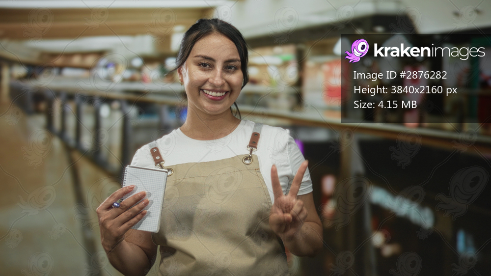 Woman waitress holding notepad and pen shows peace sign in busy mall shopping center; friendly service.