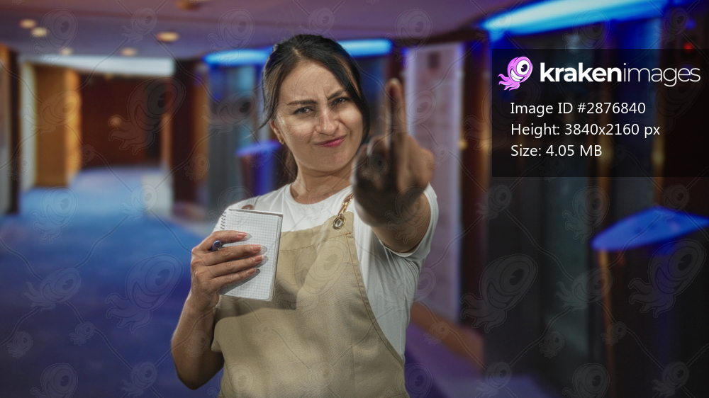Woman waitress holds notepad and pen and points finger forward in hotel building corridor with apron visible; frustration.