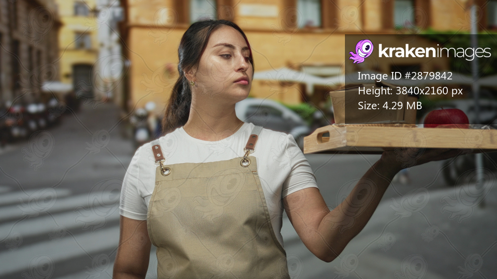 Woman waitress in apron holding a wooden tray with takeaway boxes and apple, balancing it at shoulder height on a city street; daily work fatigue.