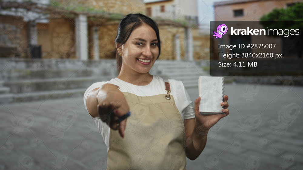 Woman waitress in apron points finger to camera while holding notepad and pen on outdoor stone steps near building; friendly welcome service.