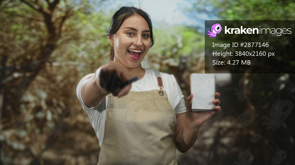 Woman waitress wearing beige apron holding spiral notepad and pointing pen toward camera in forest path; cheerful service.