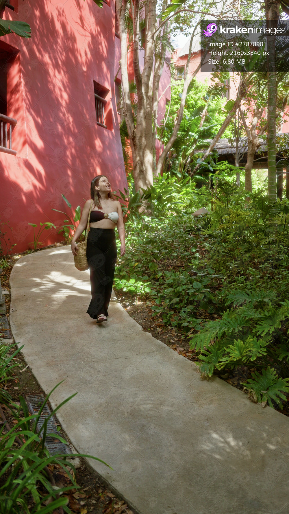 Woman walking along a lush tropical resort path beside a red building, enjoying the serene surroundings and sunny day.