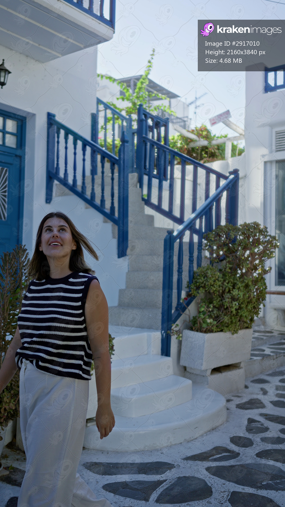 Woman walking down a mykonos street by white steps and blue railing, smiling and touching her hair while descending stone stairs; serenity.