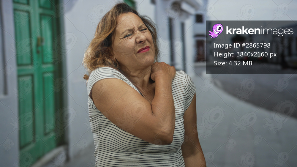 Woman walking with focused gaze and bare arms on a sunny street framed by white buildings; determination.