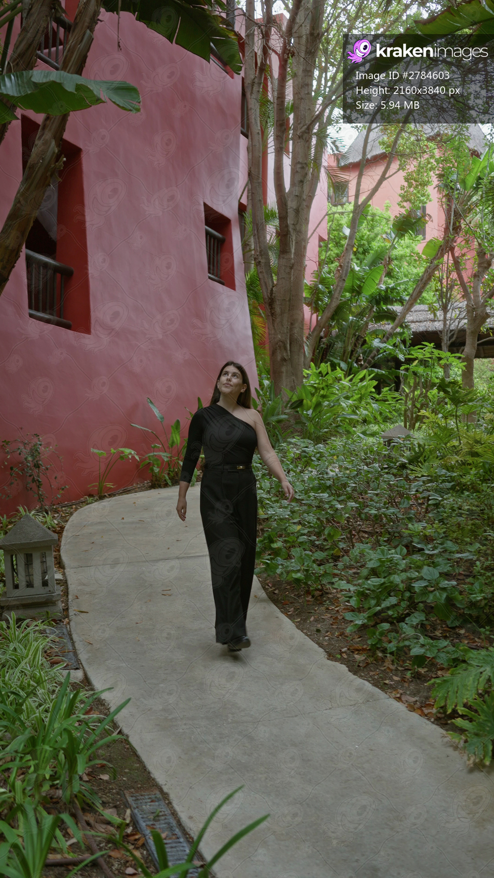 Woman walking in lush tropical hotel garden surrounded by vibrant plants and red buildings, exuding luxury and relaxation.