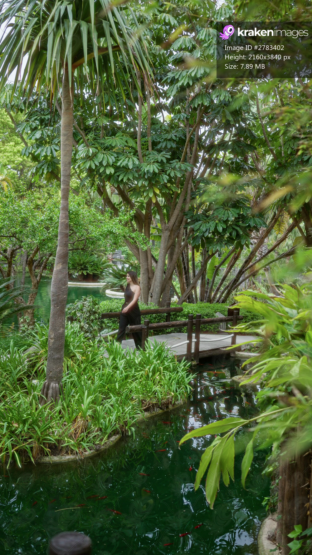 Woman walking on a bridge surrounded by lush tropical trees and greenery at a luxury resort creating a serene and peaceful atmosphere in an exotic hotel setting. - Kraken Images