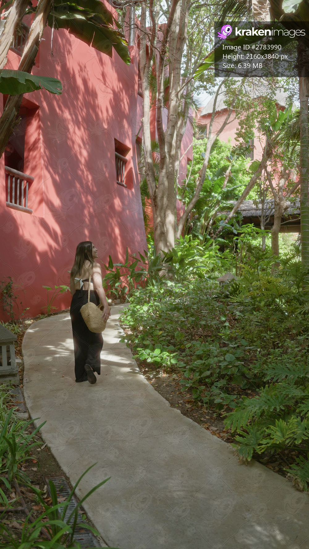 Woman walking on a lush tropical path at a luxury resort with red buildings, showcasing a serene vacation atmosphere.
