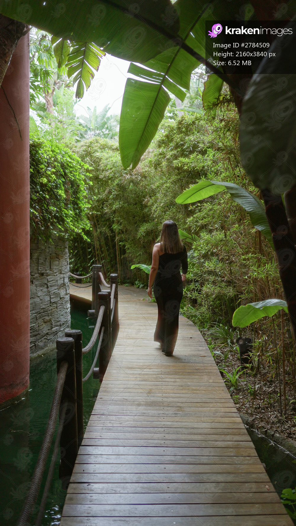 Woman walking on a wooden path surrounded by lush tropical greenery at a luxury resort with a serene ambiance and exotic plants creating a tranquil escape. - Kraken Images