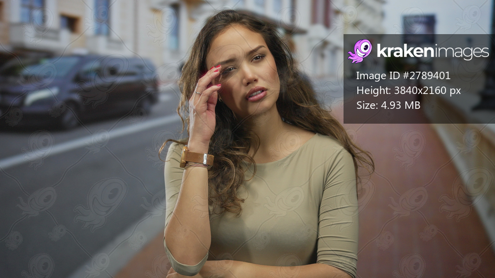 Woman walking on urban street appears thoughtful, set against a backdrop of buildings and redbrick sidewalk, showcasing a calm daytime outdoor atmosphere. - Kraken Images