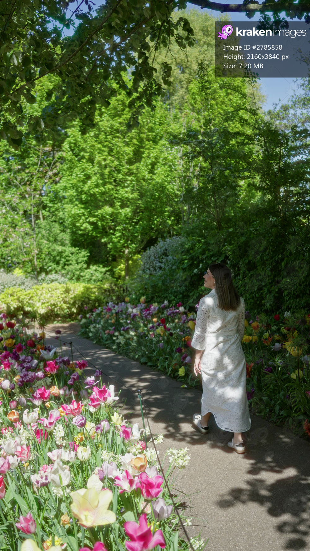 Woman walking through a vibrant tulip garden in lisse netherlands surrounded by lush greenery and colorful flowers under a clear blue sky during a sunny day. - Kraken Images