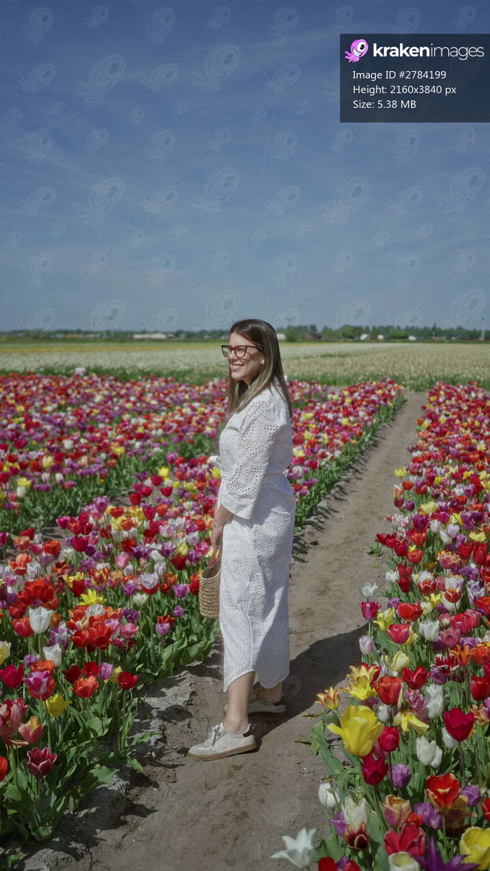 Woman walking through vibrant tulip field in lisse, netherlands, wearing white dress and holding basket under clear blue sky, showcasing beauty and diversity of nature. - Kraken Images