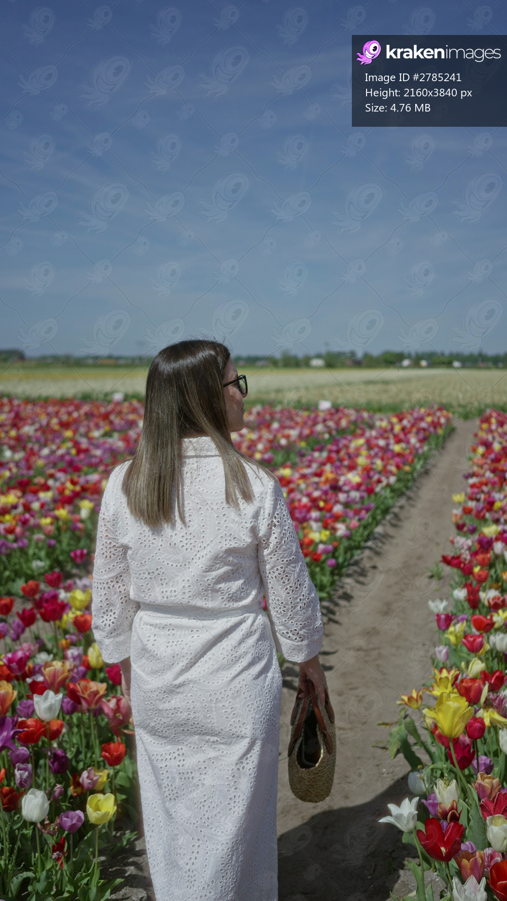 Woman walking through vibrant tulip field in lisse, netherlands, wearing white dress and holding basket under clear blue sky, showcasing beauty and diversity of nature. - Kraken Images
