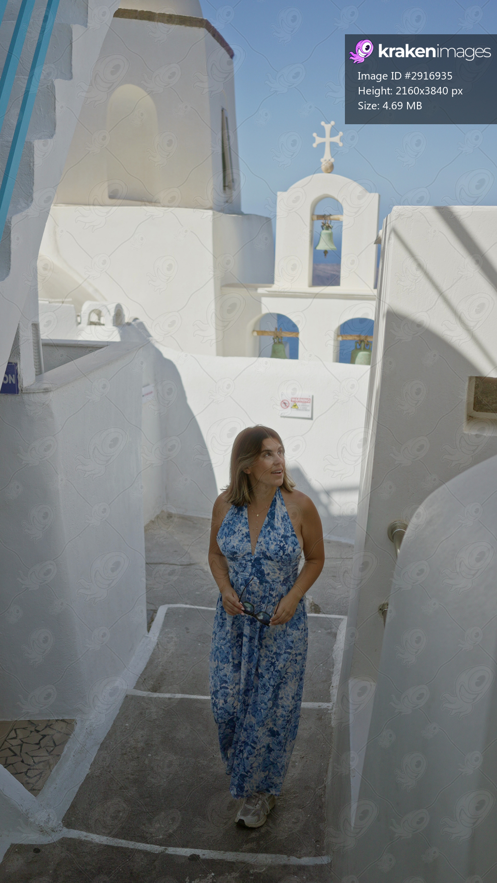 Woman walking up white steps holding sunglasses in a greek church building in santorini; serenity travel.
