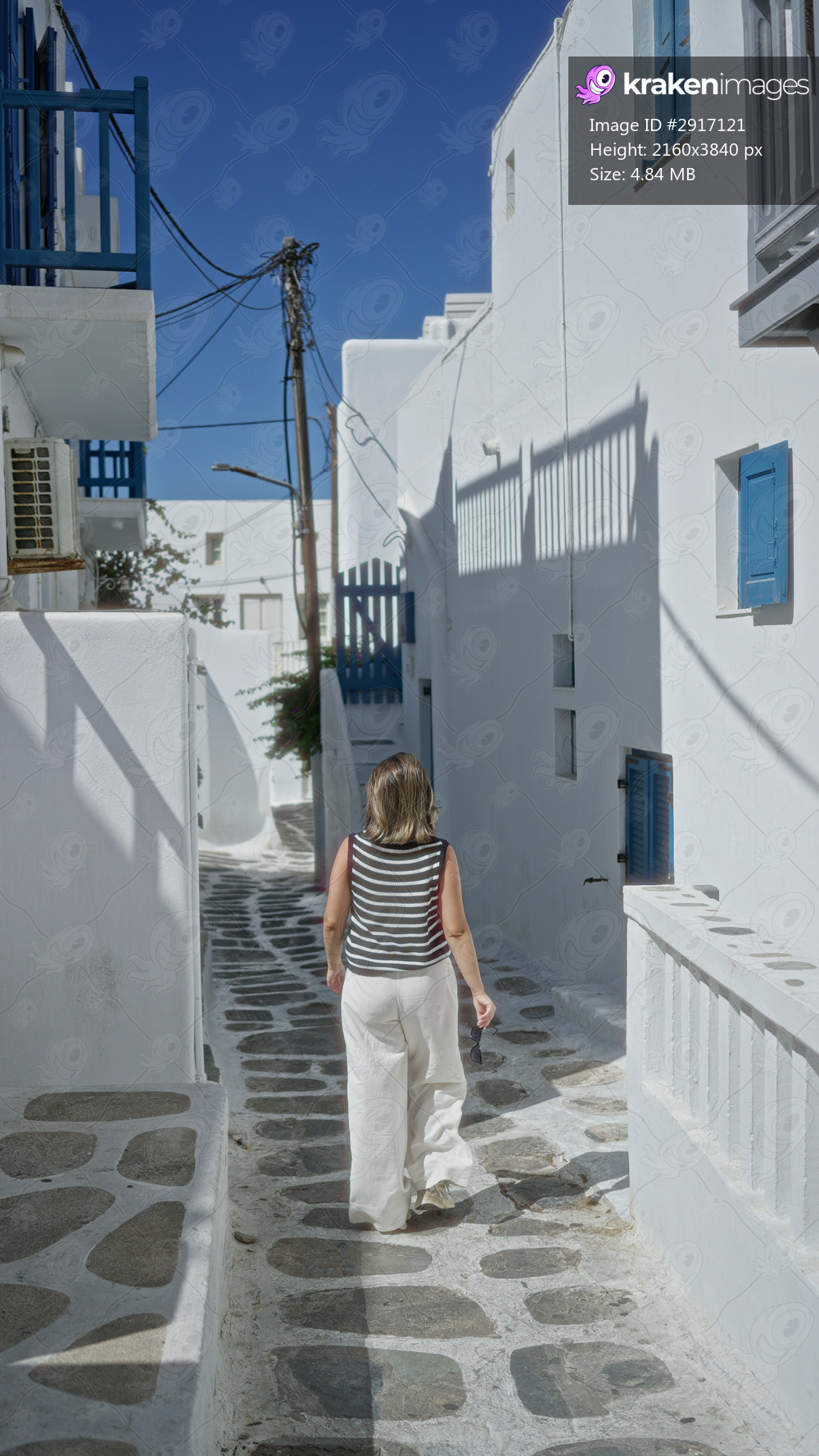 Woman walking while holding sunglasses on a narrow white street in mykonos; travel exploration serenity.