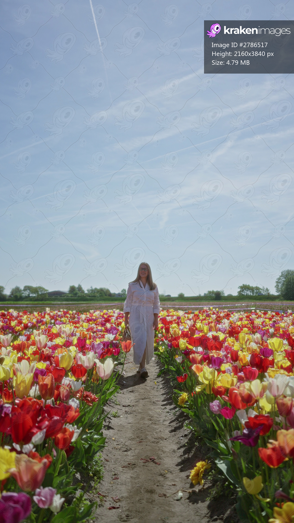 Woman walks through colorful tulip field in lisse netherlands on a sunny day dressed in white enjoying vibrant spring flowers under clear sky