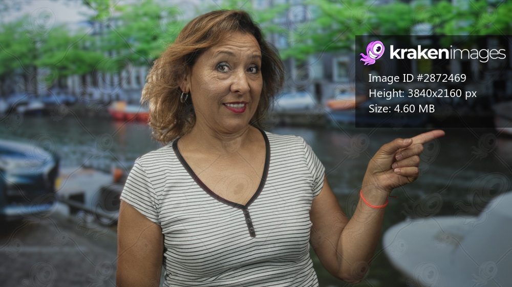 Woman with warm smile and hand to ear gesture by canal water on amsterdam street; yearning for connection.