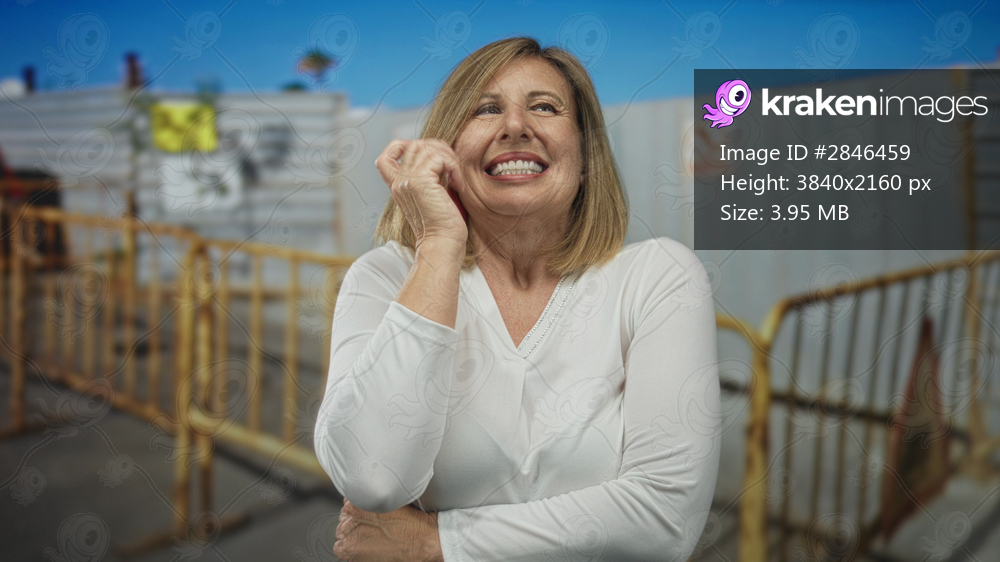 Woman waves arm at building site barricade in front of corrugated metal wall while smiling broadly; cheerfulness.
