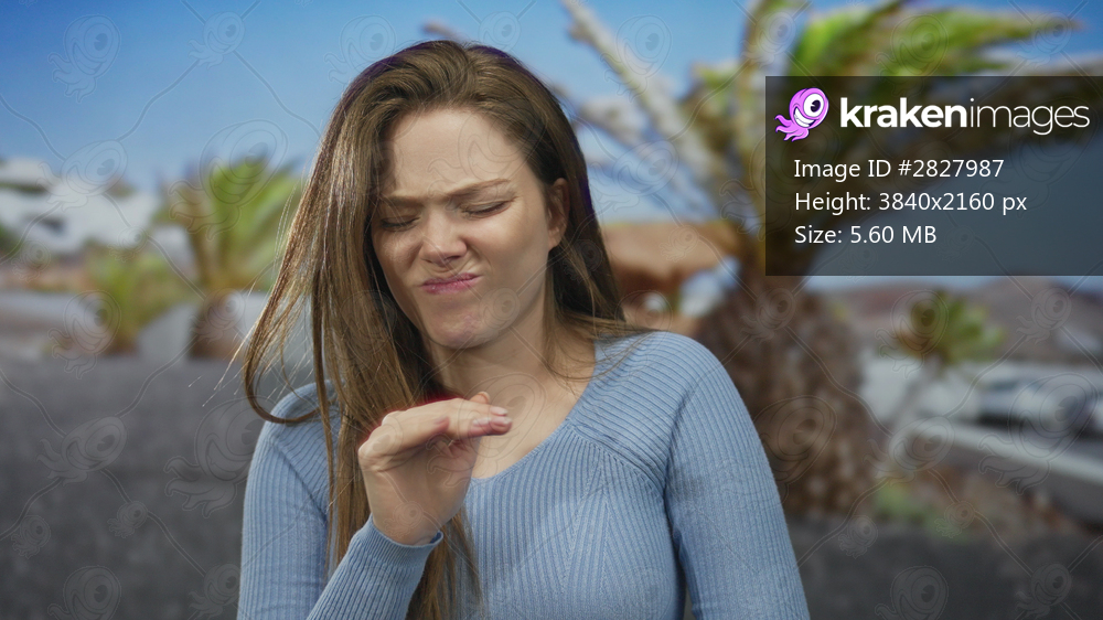 Woman waves bare hand near nose on coastal sunlit street lined with swaying palm trees; disgust revulsion.