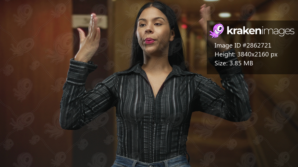 Woman waves both hands in hotel building corridor to fan her face under soft warm lighting; relaxation.