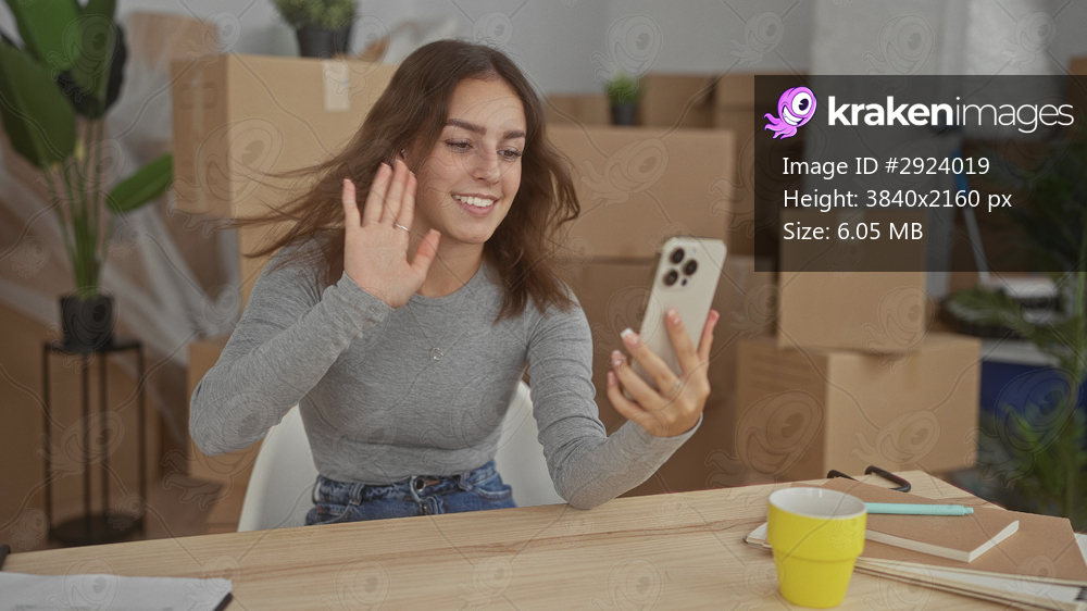 Woman waves hand at smartphone in house among packed moving boxes and a table with mug; home connection joy.