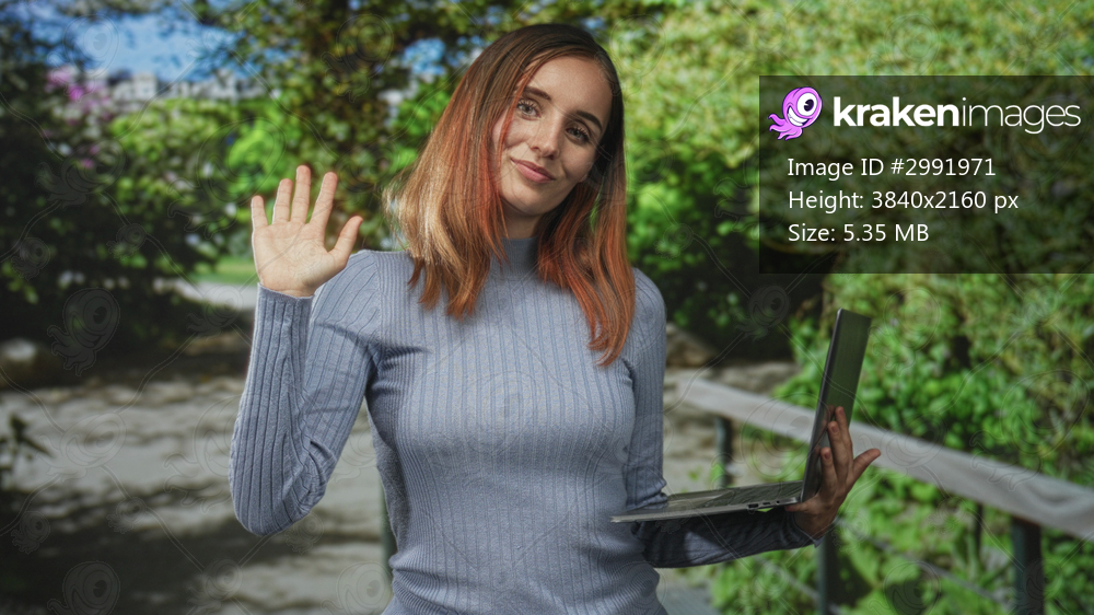 Woman waves hand holding laptop on a forest path, redhead in a light sweater and casual pose; friendly greeting.