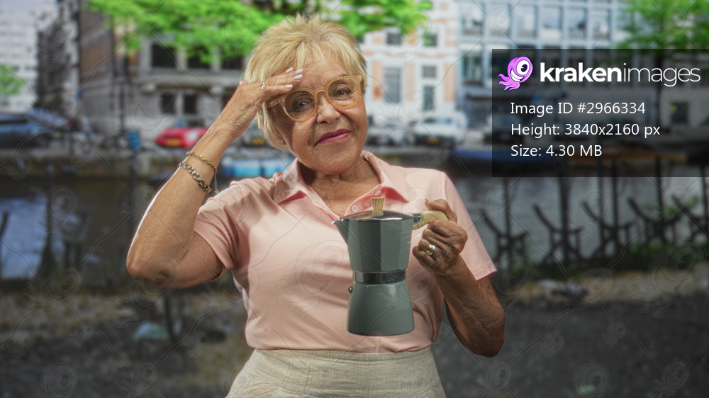 Woman waves hand and holds moka pot coffee maker on a street by canal buildings; friendly welcoming moment.