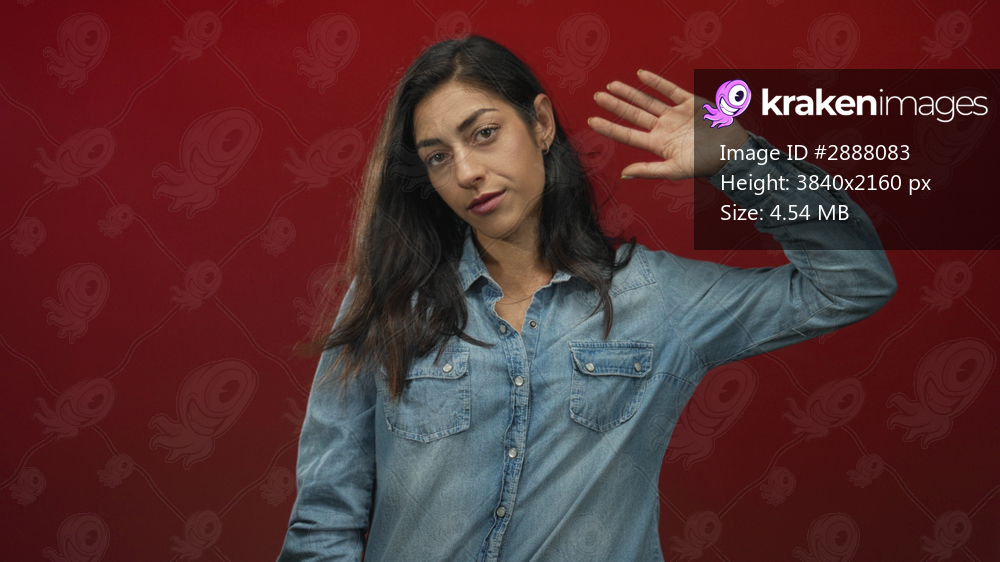 Woman waves hand in red studio wearing denim shirt and looking at camera in a casual waist up pose; farewell calm.