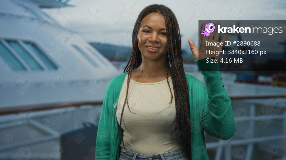 Woman waves hand on cruise ship deck near building structure, braided hair visible and casual top, palm raised in greeting; friendly greeting travel.