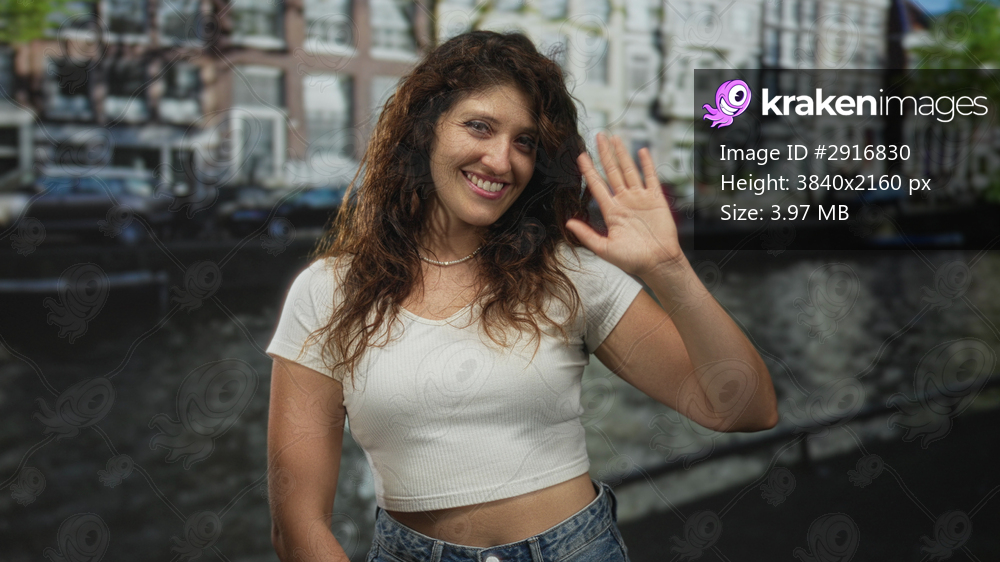 Woman waves hand on street by canal in amsterdam wearing white crop top and jeans; friendly greeting.